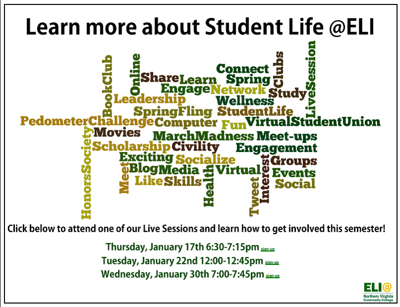 ELI. Sign up for webinars on exploring career options, library orientation for