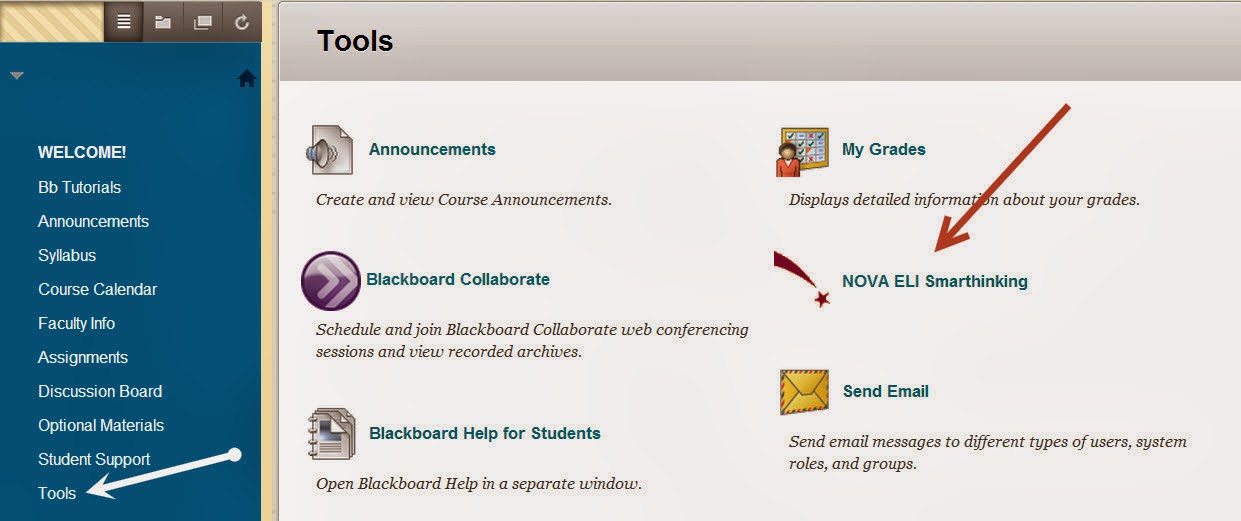 log into Blackboard, select “Tools” and click on the NOVA ELI Smarthinking