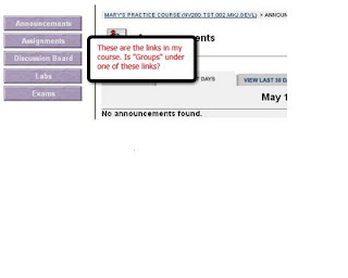 Screen shots: Here is an example where your instructor tells you to go to the “Groups” area to answer the first question. You, however, do not have a “Groups” area in your course. This screen shot allows the instructor to see what links you have in your course.